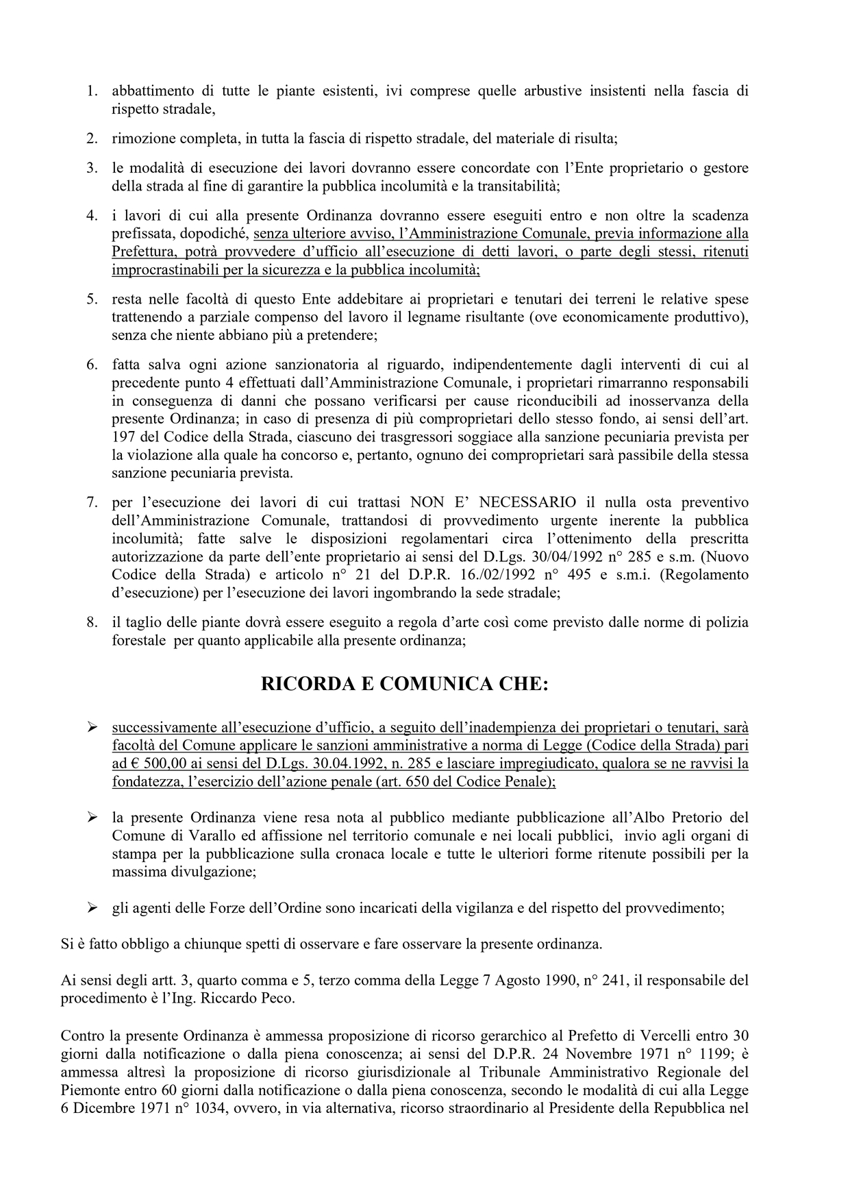 A tutti i proprietari, possessori o tenutari/conduttori, frontisti delle Strade Comunali di uso pubblico e lungo gli alvei dei corsi d’acqua a ridosso delle stesse, situati nel territorio comunale, si ordina di eseguire NEL PERIODO COMPRESO TRA IL 1° OTTOBRE ED IL 30 MARZO DI OGNI ANNO: