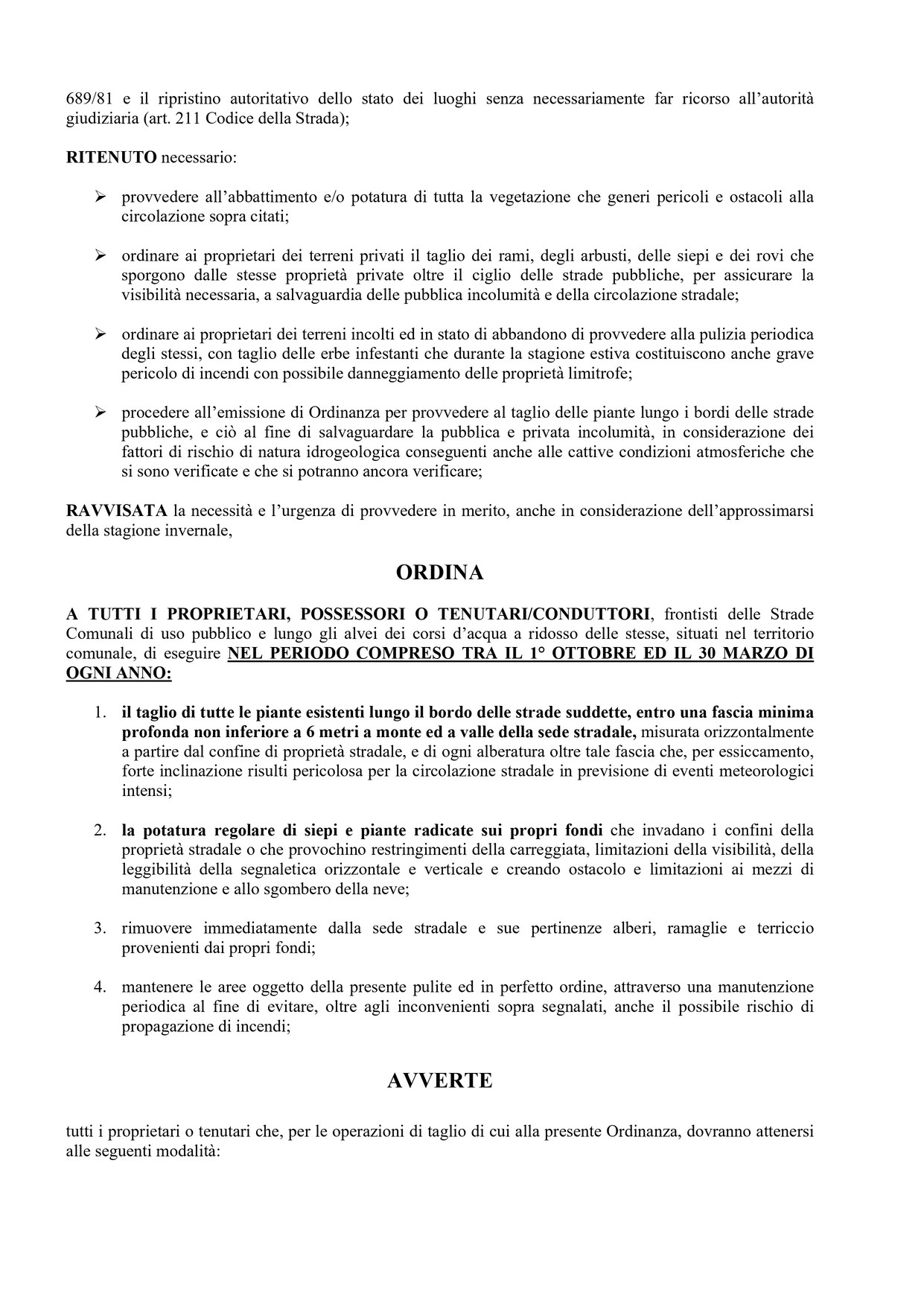 A tutti i proprietari, possessori o tenutari/conduttori, frontisti delle Strade Comunali di uso pubblico e lungo gli alvei dei corsi d’acqua a ridosso delle stesse, situati nel territorio comunale, si ordina di eseguire NEL PERIODO COMPRESO TRA IL 1° OTTOBRE ED IL 30 MARZO DI OGNI ANNO:
